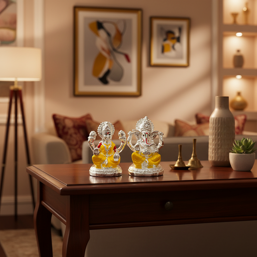 Silver Yellow Idol Set: Round-style Lakshmi and Ganesh statues crafted with a refined silver finish and yellow detailing for a bright, elegant look